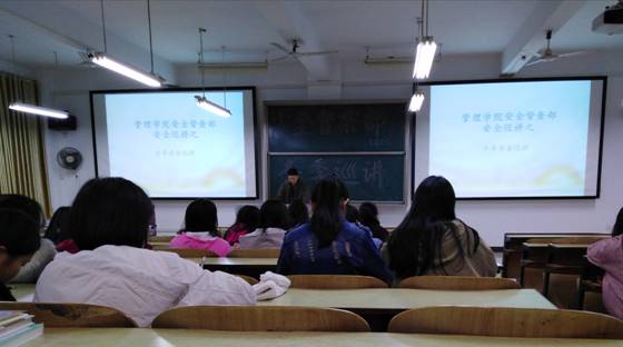 12月5日星期三晚自习,为了提高同学们冬季安全意识的美好初衷,管理学院学生联合会安全督察部在教学楼d栋303展开了以防火、防骗、防盗、警惕校园贷等多个主题的安全巡讲。