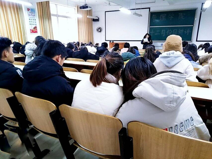 12月11日中午12:10,管理学院大一大二全体同学、大三大四全体班委及报考四六级的同学,在主校区教室内进行本学期第四次月评会议。学办辅导老师罗荃、黎博、单艳艳、包海燕、周艺、宋志航对工商管理、电子商务、旅游管理、人力资源管理、会计学、物流管理、市场营销七个专业进行了讲评。