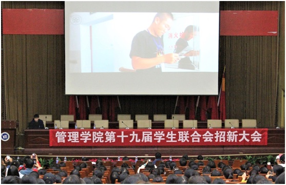会议在妙趣横生的管理学院学生联合会招新视频后正式拉开帷幕,主持人开场后,各部门部长依次上台介绍。部长们精心准备并播放了部门招新视频,现场欢笑不断,新生们在感到欢乐的同时也更加具体的了解到了各部门的基本职能。学习部的“开学攻略”、办公室的“假装正经”、女生部的“认真搞笑”、纪检部的“安全小剧场”使现场一次次爆发出欢笑声。而不同于他们的幽默风趣,青年志愿者中心、安全督察部、公关礼仪部等部门则以认真严谨抓住了新生们的心。宣传部、心理部、实践部以一种常态的方式让新生感觉到了温馨,科技部、艺创部、创新创业部、就业服务部以及体育部用新颖的视频和真正的实力吸引了新生目光,俘获了不少人的心,文艺部的精彩表演、人事部的真诚打动了他们,组织部的工作也十分受欢迎,而压轴出场的生活部更是为疲惫的学生们带来了欢乐,让他们的疲惫转化为动力。