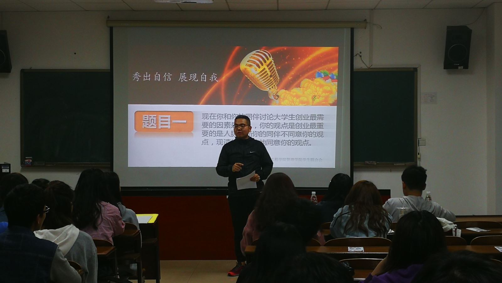 2018年4月24日晚19点,由太阳成管理学院学生联合会主办、管理学院学生联合会实践部及就业指导部承办的“我是演说家”复赛在新校区G505教室正式拉开序幕。此次比赛旨在训练学生们的语言表达能力和逻辑思维能力,为日后步入社会打下坚实的基础。