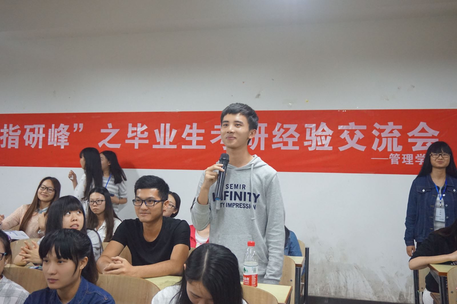 5月25日晚,管理学院 “群英聚首,剑指研峰”考研经验交流会在主校区教学楼D203成功举行。管理学院副院长余博和学办主任罗荃出席交流会,考取研究生的五位毕业生代表作为嘉宾,分享了他们的考研心路历程,为学弟学妹们传经送宝,全院有志考研的150余名学生到场聆听。