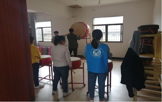 切完菜之后,志愿者们又开始和小伙伴一块打鼓。先是志愿者进行演示教大家打鼓,小伙伴学会后,大家便开始一起敲鼓。玩的尽兴之后,志愿者们和小伙伴一起把鼓具依次的放回了原处。