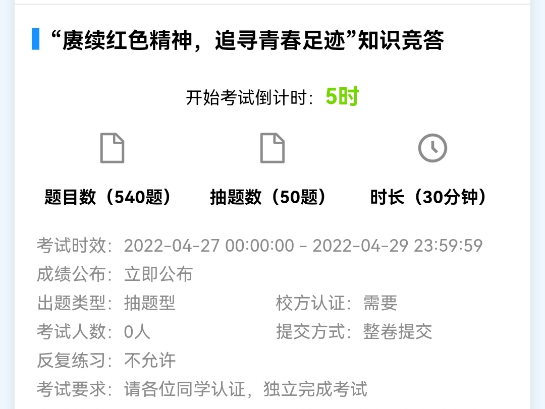 活动伊始,易班管理中心向各班下发有关以”赓续红色精神,追寻青春足迹“为主题的答题竞赛通知,并由易班管理中心通知各班班长组织学生加入易班优课课群,并于27日至29日按年级分批次完成答题。本次答题活动借助易班APP采取线上考试的方式,所设题目难度适中,内容涵盖中国共产主义青年团建团一百周年来的发展历程。