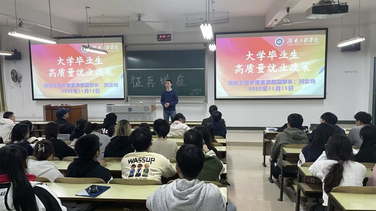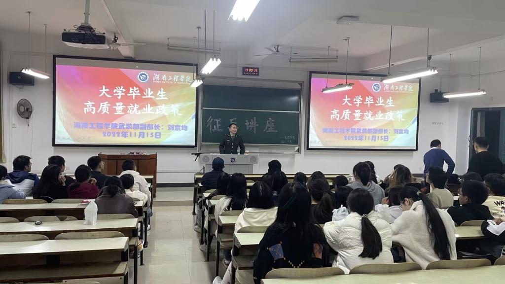 讲座期间,刘老师主要讲述当前国家对大学生参军入伍的优惠政策,并通过入伍故事分享、就业形势分析、考公考研政策优惠等方面让同学们能最直观感受到最新政策对其人生的影响。刘老师生动形象地将选择部队比作一场旅行,旅途中不仅身体素质能明显提高,而且在人际交往、抗压能力、知识眼界等方面都将焕然一新。他表示:收获的不单是沿途的风景,更是人生道路上无价的财富,选择一场军旅,无悔于青春韶华。