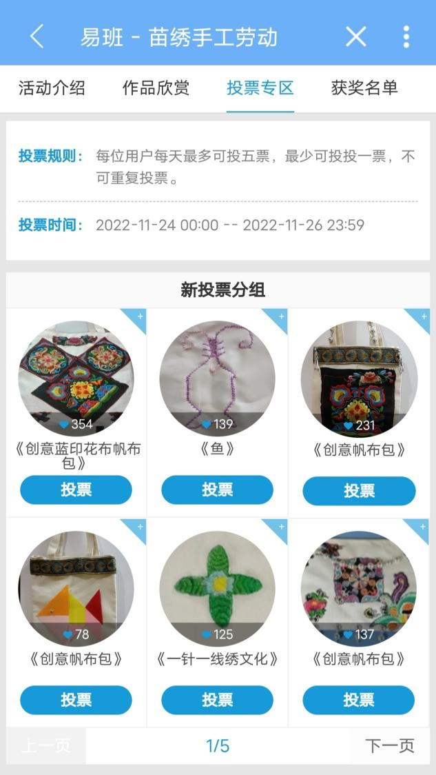 本次活动由资助中心准备好活动过程中要用到的材料、布置活动场地、收集参赛作品,并将作品拍照转交给易班管理中心。其次,易班管理中心搭建轻用快搭平台。同学们于11月24日—26日对自己心仪的作品进行投票。活动结束后,由资助中心为获奖选手颁发证书。在我院同学的积极参加和热情投票下,最后根据得票情况评选出特等奖两名,一等奖一名——TTLYZ队《创意蓝印花布帆布包》,二等奖两名——苗绣小天才队《冰墩墩》、今天也要加油队《苗绣小背心》,三等奖三名——爱会消失对不队《创意帆布包》、今天也要加油队《喵喵喵蝴蝶绣》、锦绣山河队《望舒曦和》。