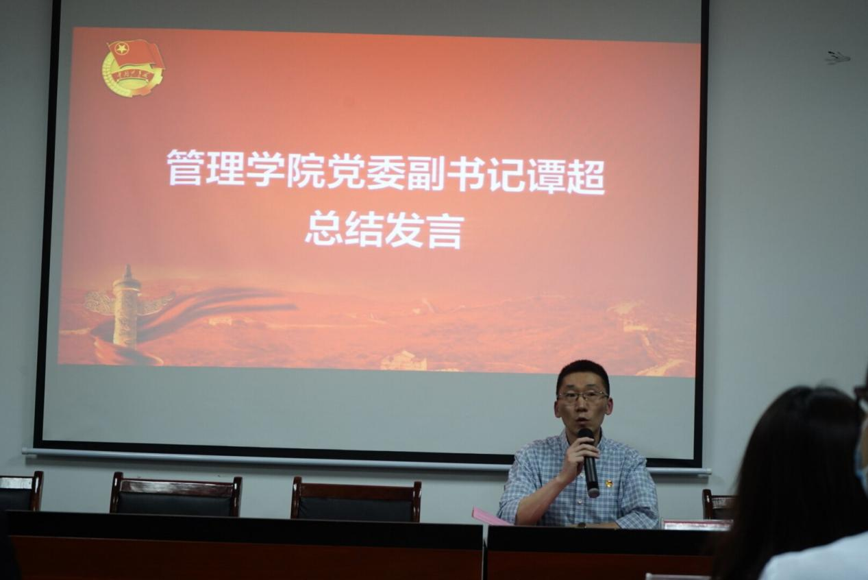 管理学院党委副书记谭超总结发言,他高度肯定了此次活动的意义,并号召广大团员青年要深入学习贯彻落实党的二十大精神,紧跟党迈上全面建设社会主义现代化国家新征程,踔厉奋发、勇毅前行,焕发出“为有牺牲多壮志,敢叫日月换新天”的革命精神,呐喊出“请党放心、强国有我”的时代强音。