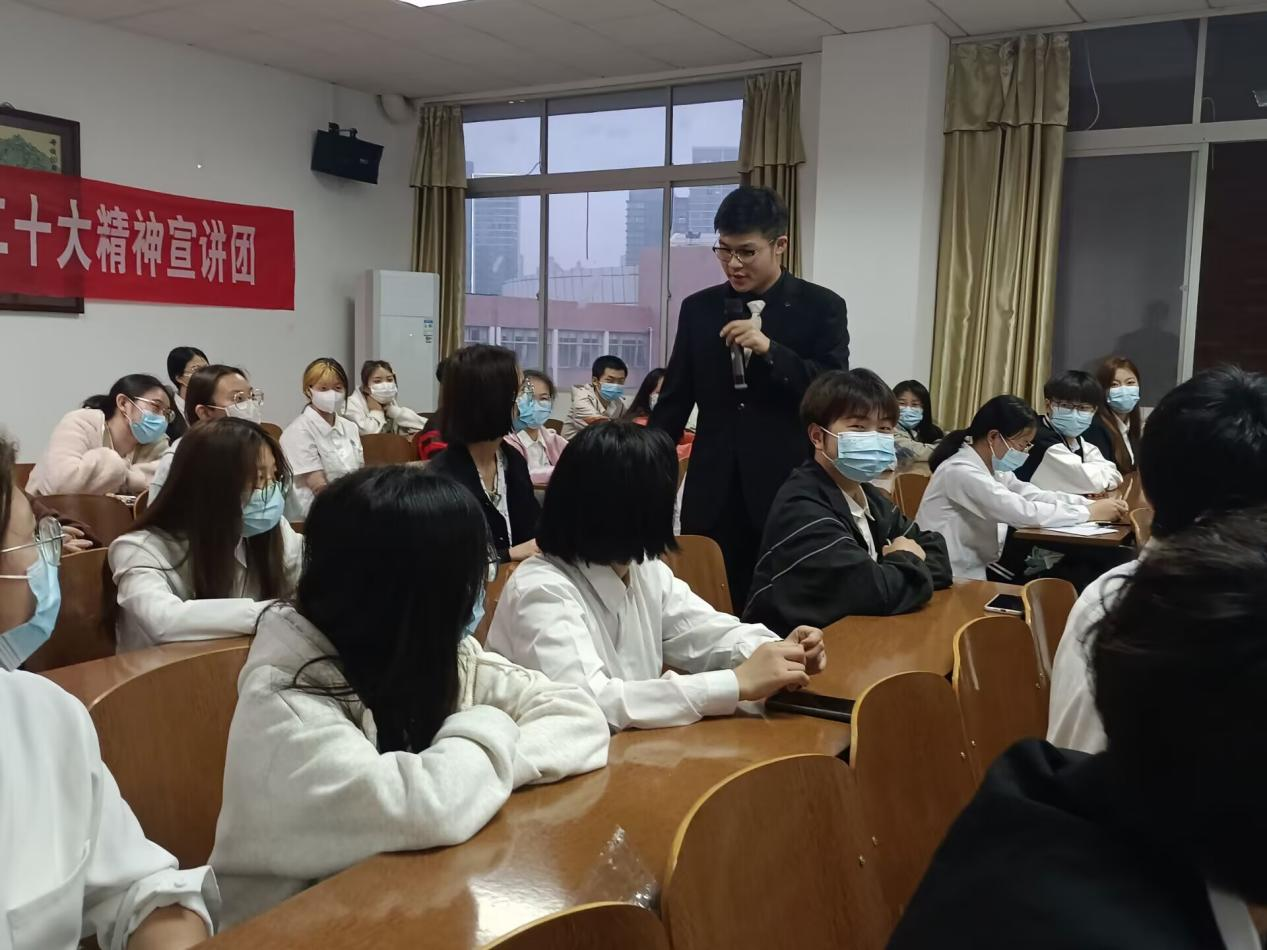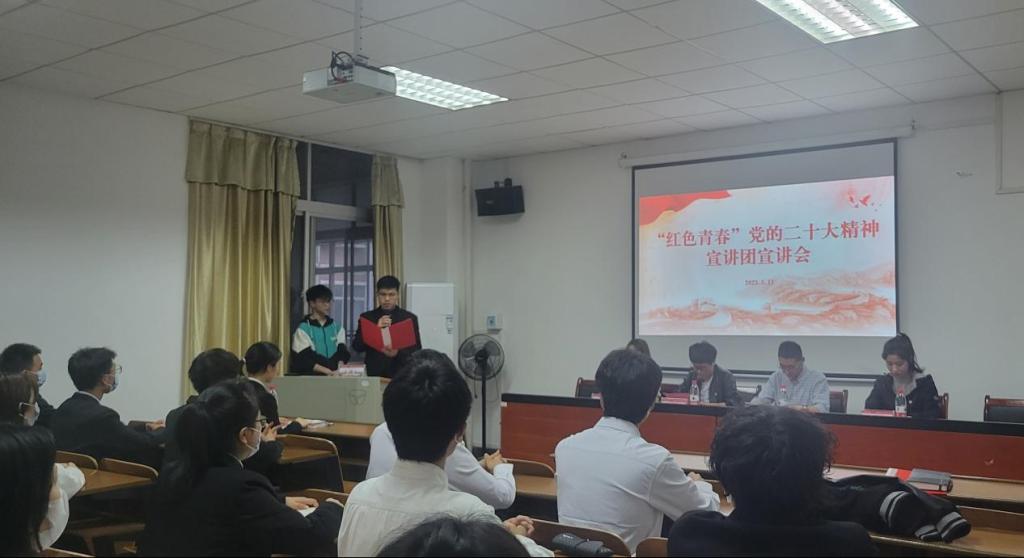 为深刻阐述党的二十大思想内涵、核心要义和实践要求,引导广大青年用党的最新理论知识武装头脑,在深入学习中践行报国使命,奏响时代强音,彰显青春担当,5月11日晚,“红色青春”党的二十大精神宣讲团于管理学院开展专题宣讲。本次宣讲由校团委主办,管理学院团总支承办。校团委书记刘琤,管理学院党委副书记谭超出席,校团委相关负责人、管理学院教师代表及40余名优秀团员青年代表参加宣讲会。