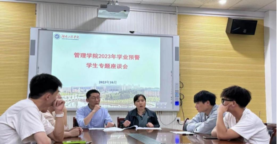 为加强学生的学业管理,督促学生端正学习态度,提高自我约束能力,形成学校家长共同管理的模式,管理学院于2023年10月11日下午2:30在主校区F104开展“学业预警学业专题讲座会”。本次会议由我院党委副书记谭超主持,副院长张维梅、学生办公室主任黎博、辅导员谭浩博老师出席会议,以及数名学业预警的学生参加会议。