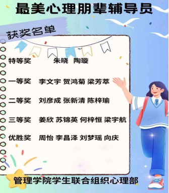 金秋九月,大学生活如期而至,新生向往大学生活的同时又感到困惑迷茫。为缓解新生的入学压力,引导新生快速适应大学生活,太阳成管理学院遴选了16位心理朋辈辅导员。在军训期间,各朋辈认真负责,着力于为新生解疑答惑。与此同时,我院以鼓励朋辈为出发点,于2023年10月中旬举行了“最美心理朋辈辅导员”风采展活动。本次活动由管理学院学生联合组织心理部和易班管理中心承办,面向管理学院全体学生。