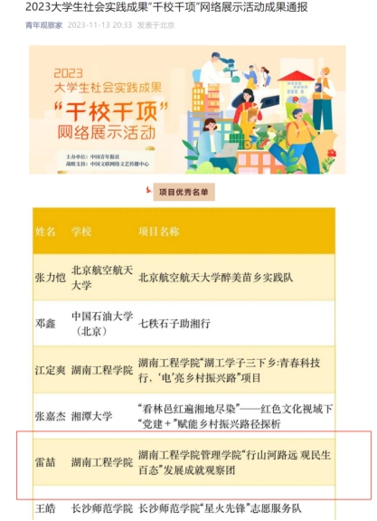 近日,中国青年报社主办2023大学生社会实践成果“千校千项”网络展示活动公布获奖名单,我院“行山河路远 观民生百态”发展成就观察团获评优秀项目。