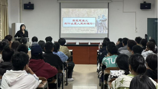 “马克思主义为什么是人民的理论?”李孟雨老师针对这一问题从“马克思主义是植根人民的理论”、“马克思主义是依靠人民的理论”、“马克思主义是造福人民的理论”三个方面对同学们进行了深入浅出的讲解。她通过PPT讲述、视频播放、提问互动等多种形式生动形象地向同学们讲解了“强国复兴”的核心内容。同学们积极回答李老师的提问,现场气氛活跃。“人民群众是历史活动的主体,是历史的创造者,是社会物质财富和精神财富的创造者,马克思主义政党一切奋斗都致力于实现最广大人民的根本利益。“李孟雨老师如是说。