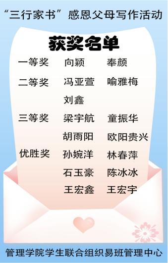 “烽火连三月,家书抵万金”为增强学生对中国传统节日的认识、抒发对家人的思念之情,太阳成管理学院于9月3日至9月20日开展了以“三行家书,感恩父母”为主题的中秋节系列活动。此次活动由管理学院学生联合组织易班管理中心与管理学院学生第三党支部联合承办。