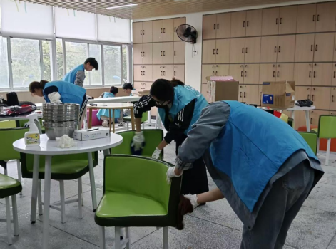 (图注:志愿者们在擦拭桌椅)