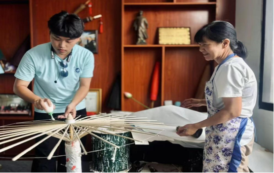 传承之旅从石鼓镇启程。在当地工作人员引导下,实践团走进油纸伞工坊,实地了解这一非遗技艺的制作工艺与传承现状。陈列墙上,一把把油纸伞宛如艺术臻品,凝结着匠人的智慧与情感成员们亲身体验“锯竹、制骨、裱面、绘伞”等工序,感受一伞一匠心的细腻与精妙。采访中,传承人周汉宇分享了家族坚守油纸伞制作的故事,并表达了对年轻一代加入非遗传承队伍的期盼。