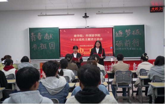 为深入学习贯彻习近平新时代中国特色社会主义思想,引领青年学子厚植家国情怀、勇担时代使命10月23日晚在校团委的指导下,ok138cn太阳集团与外国语学院在主教学楼C309教室联合举办了“青春献礼祖国,逐梦砥砺前行”示范性主题团日活动。校团委副书记涂璐、ok138cn太阳集团党委副书记谭超、ok138cn太阳集团团委书记邹牡燕、外国语学院团委书记彭虹出席活动,英语2501班、电子商务2401班全体同学共同参与。