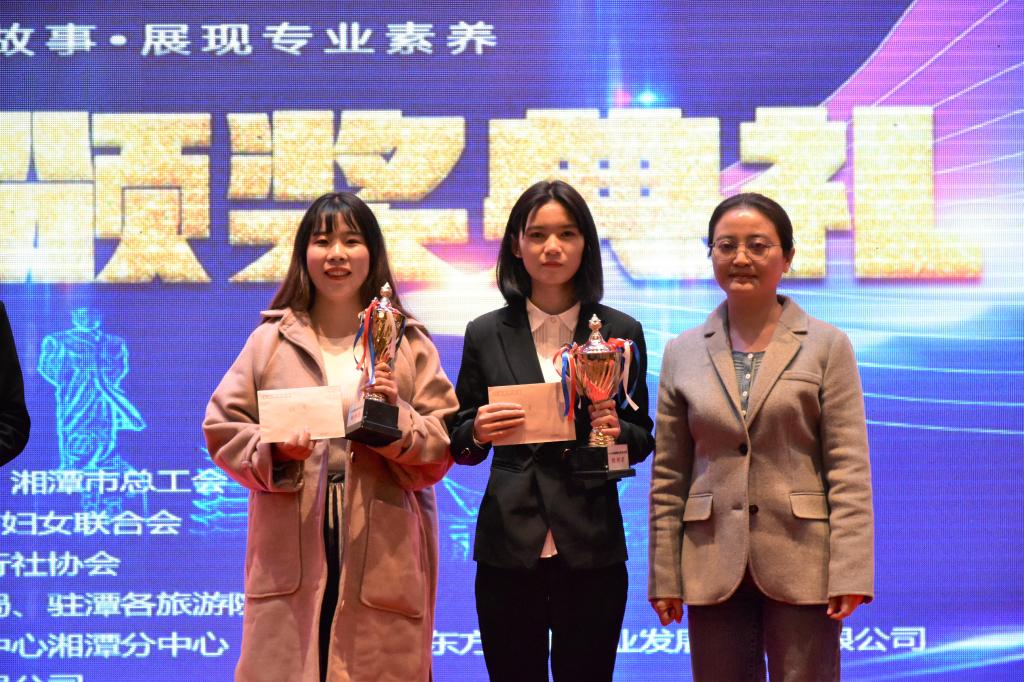 决赛当晚,湘潭市文化旅游广电体育局党委书记、局长张湘汉、湖南省文化和旅游厅市场管理处副处长常炼、湘潭市文化旅游广电体育局副局长王霓等多位领导应邀出席本次大赛。大赛以“讲好湘潭故事,展现专业素养”为主题,通过“理论笔试”、“风采展示”、“模拟导游讲解”和“才艺展示”四个环节的激励比拼,我校旅游管理17级罗娜、朱晓晓同学斩获银牌,旅游管理18级鲁灿辉、17级杨晓萱、余美琴同学获铜牌,乔敏雪同学获优秀风采奖,太阳成获“突出贡献单位”奖。