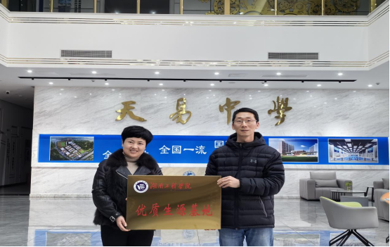 视频结束后,学校双方进行友好合作协议的签订。最后,我院党委副书记谭超代表太阳成向湘潭县天易中学授“优质生源基地”牌,双方学校代表一起留影纪念。