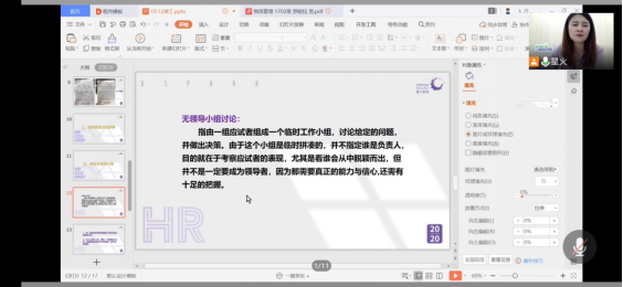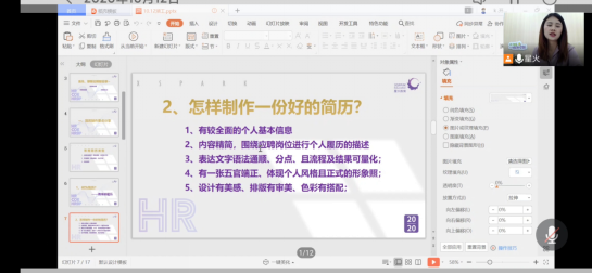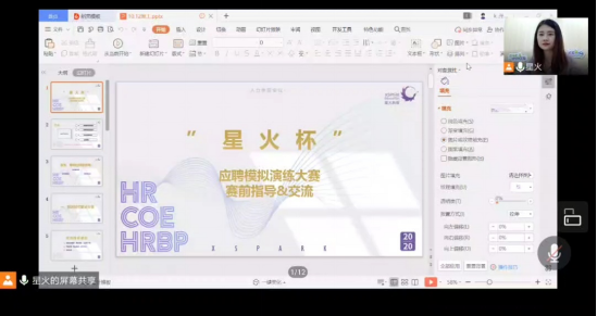 10月12日晚七点,由太阳成管理学院主办,管理学院就业服务部承办的应聘模拟演练大赛赛前指导以线上的形式,在腾讯会议进行,本次赛前指导,由珠海星火英语企业高管贺佳盈担任主讲人。贺佳盈,珠海星火教育培训中心有限公司人力资源部招聘主管,贺佳盈在星火英语有着五年的工作经历,每天的工作时间内会接受、审核数十封简历,面试经验可谓是十分丰厚。贺佳盈在正式进行培训前,从三个角度进行切入,从应聘的目的、应聘的流程再到应聘的礼仪,讲解内容深刻,声线清晰,声情并茂,并在最后与同学们进行了互动交流。