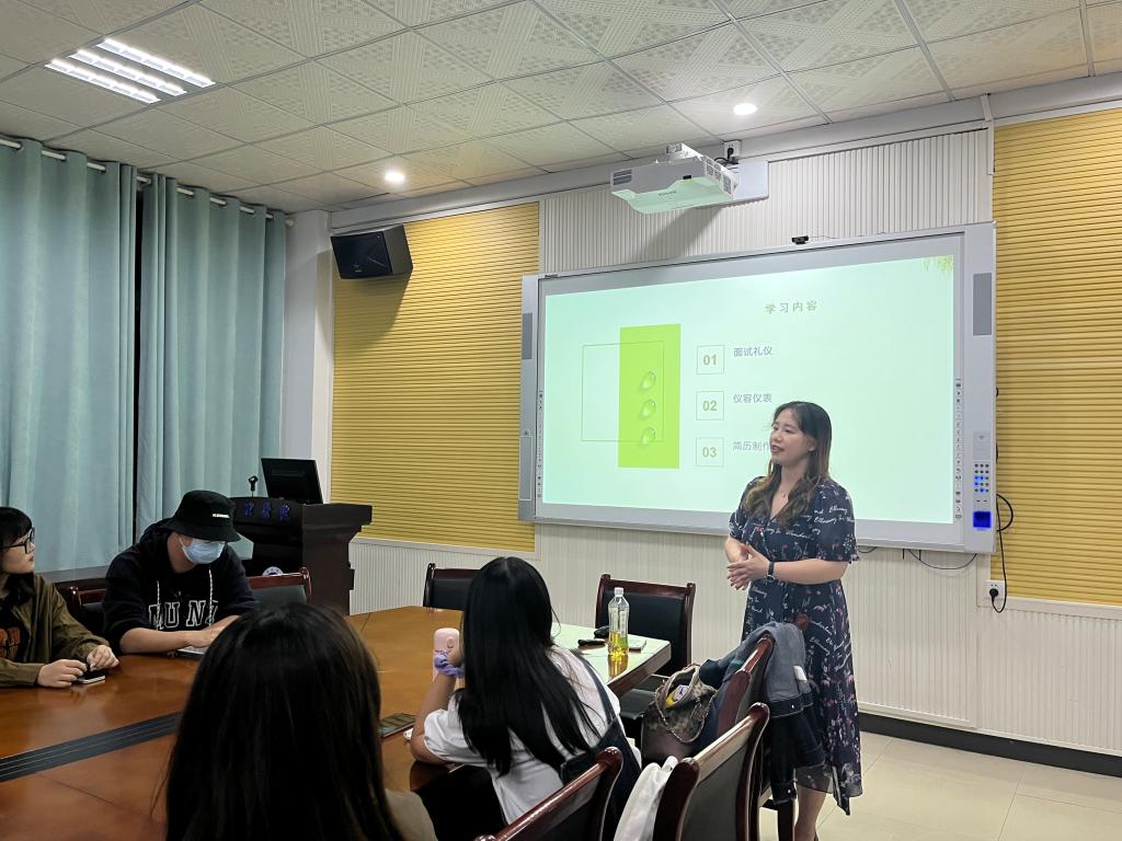 此次培训,胡湘兰老师从面试礼仪、仪容仪表、简历制作三个方面来进行阐述。首先,胡湘兰老师结合PPT从基本的站姿、坐姿入手将面试时需要注意的礼仪礼貌向选手们娓娓道来;在简历制作方面,胡湘兰老师以专业技能证书作为重点进行讲述,以自己的学生应聘时的经历来为选手们说明技能证书在简历制作中的重要性。在培训会上,选手们根据自己的需要进行摘录并且积极与老师进行互动交流。最后,本次培训会在选手们热烈的掌声中圆满结束。