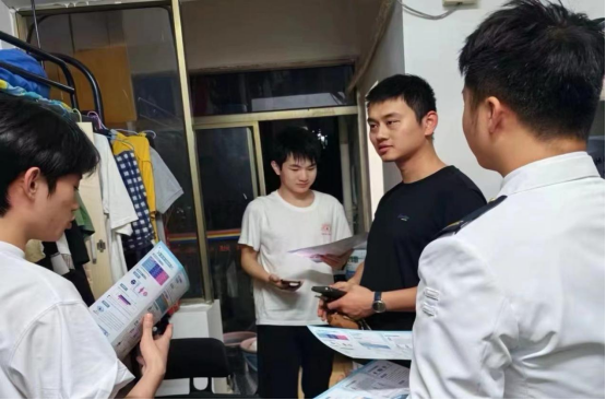 活动伊始,在武装部邢承勇老师和管理学院谭浩博老师的带领下,安全督察部的同学们分为两组深入学生宿舍,发放《征兵宣传手册》,与同学们面对面交流,从兵役登记、身体条件、入伍程序、优惠政策等方面详细介绍有关内容。邢老师分享自己的参军生活,介绍军队建设的伟大成就和一丝不苟的军队纪律。同时,邢老师结合往届毕业生的参军入伍体验,全方位、深层次就大学生参军有关政策进行详细解读,进一步帮助同学们算好参军入伍的经济账、升学账和发展账。